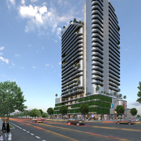 Millennium Tower rises as a sculptural residential complex that demonstrates how fluidity can merge with material technology in contemporary architecture. Constructed on a massive 203,000 m² site, the project is shaped by continuously curving lines and gentle curves rather than a simple geometry. The balcony lines surrounding the building are not merely architectural gestures; they are also functional elements that provide natural light, views, and microclimate control. A commercial strip on the ground floor defines the building's street-facing facade and supports public use. Gray aluminum panels and glass façade modules create a futuristic yet serene aesthetic on the façade, while green terraces provide a horizontal counterpoint to this vertical mass. The project offers a new definition of a hub for a developing district like Qoylık.